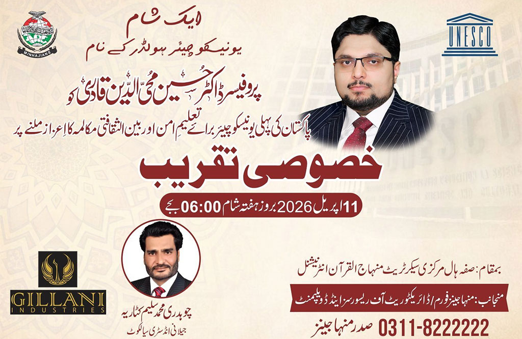 لاہور (11اپریل 2026) تحریک منہاج القرآن شعبہ ریسورسز اینڈ ڈویلپمنٹ اور منہاجینز فورم کے زیر اہتمام آج (ہفتہ) کو صدر منہاج القرآن انٹرنیشنل و ڈپٹی چیئرمین بورڈ آف گورنر ز منہاج یونیورسٹی لاہور پروفیسر ڈاکٹر حسین محی الدین قادری کو یونیسکو چیئر برائے تعلیم، امن اور بین اثقافتی مکالمہ تفویض ہونے پر پروقار تقریب تحسین کا انعقاد کیا جا رہا ہے۔ صدر منہاجینز فورم شاہد لطیف نے تقریب کے انتظامات و تیاریوں کے حوالے سے منعقدہ اجلاس میں گفتگو کرتے ہوئے کہاکہ تقریب میں صدر منہاج القرآن انٹرنیشنل پروفیسر ڈاکٹر حسین محی الدین قادری کو یونیسکو چیئر برائے تعلیم، امن اور بین اثقافتی مکالمہ کی ذمہ داری ملنے پر اظہار تشکر کیا جائے گا اور مبارکباد پیش کی جائے گی۔ انہوں نے کہا کہ یہ اعزاز منہاج القرآن انٹرنیشنل اور پروفیسر ڈاکٹر حسین محی الدین قادری کی امن، تعلیم کےلئے خدمات کا عالمی سطح پر اعتراف ہے۔ انہوں نے کہاکہ یہ اعزاز قومی فخر کا لمحہ ہے اور ہر پاکستانی کےلئے اعزاز کی بات ہے۔ تقریب میں تحریک منہاج القرآن کے مرکزی، صوبائی، ضلعی رہنما منہاجینز فورم کے عہدیداران، سیاسی،سماجی، علمی شخصیات کی بڑی تعداد شرکت کرے گی۔